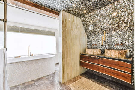 Interior of light restroom with clean bathtub and colorful cupboards with sinks in modern apartment