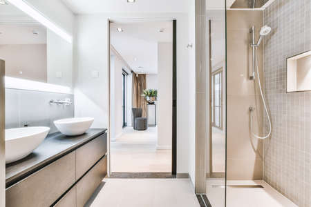 Interior of contemporary bathroom with shower and sink in minimal style in flat