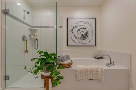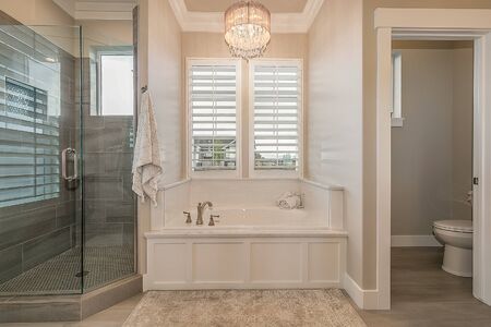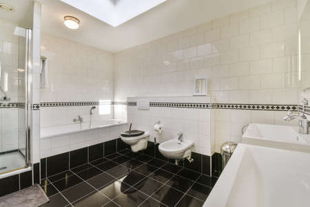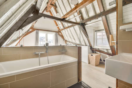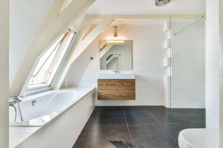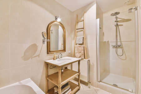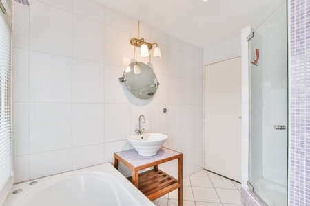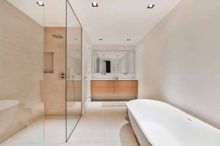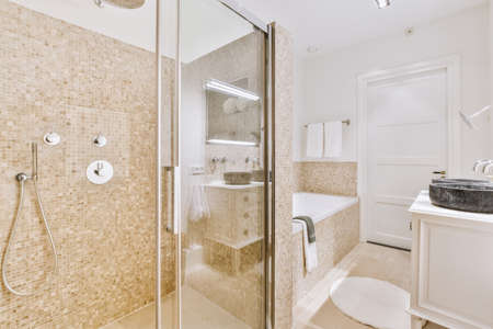 Bathroom with bathtub, shower cabin and sink in a modern and cozy house