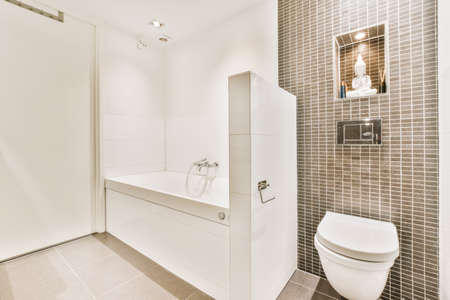 White bathtub with metal faucet in modern bathroom in minimal style in apartment