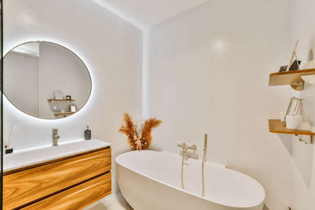 Stunning bathroom with large round illuminated mirror and sink with wooden cabinet