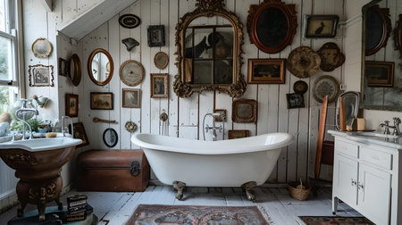 The image depicts a charming and eclectic bathroom space with a stunning clawfoot bathtub as the centerpiece The walls are adorned with a collection of vintage mirrors in various shapes and sizes