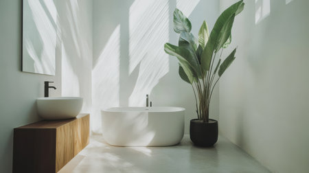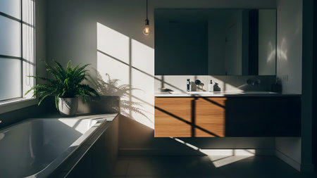 A modern bathroom interior bathed in natural sunlight, casting sharp shadows on the vanity and wall. A green fern sits on the bathtub, adding a natural touch to the sleek, minimalist design.