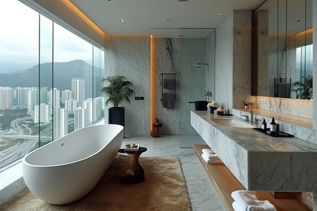 Modern bathroom with freestanding bathtub, double sink vanity, and large windows, copy space. Interior, luxury, architecture, design, contemporary, home decor, unaltered