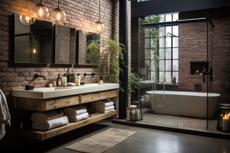 Interior of a modern bathroom with brick walls, concrete floor, comfortable bathtub and shelves with towels