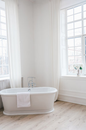 A spacious bathroom features a stylish white bathtub illuminated by ample natural light streaming through large windows.