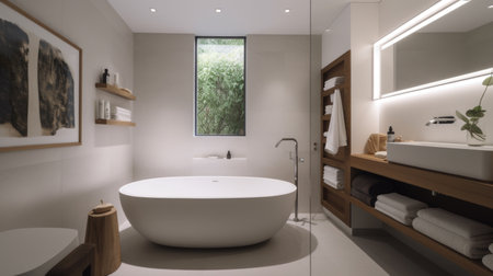 Luxurious modern small bathroom interior design with a bathtub and natural view outside the window. Generative AI AIG27.