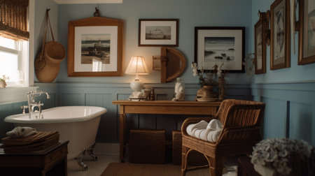 Interior design of Bathroom in Coastal style with Clawfoot tub decorated with Subway tile, Wicker material. Traditional architecture. Generative AI AIG24.