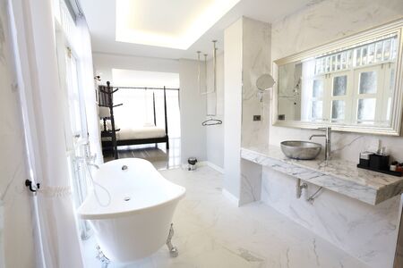 Interior design of Bathroom in Contemporary style with Freestanding Tub decorated with Marble Floor, Glass Shower material. Modern architecture. Generative AI AIG24.