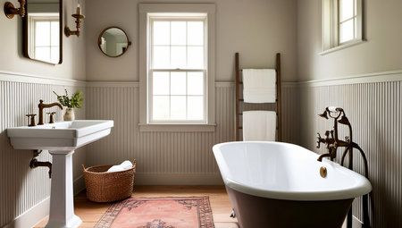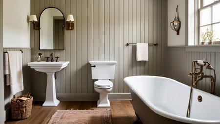 Country Comfort: Design a comfortable farmhouse bathroom with beadboard paneling, a pedestal sink, and a freestanding tub. Use soft, neutral colors, antique brass fixtures, and a vintage rug to create a warm and inviting atmosphere