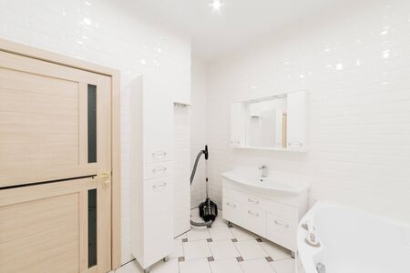 Russia, Moscow- August 05, 2019: interior room apartment modern bright cozy atmosphere. general cleaning, home decoration, preparation of the house for sale. modern bathroom, sink, decoration elements, toilet