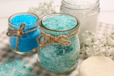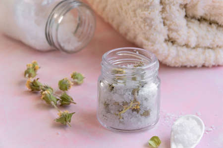 Natural herbal sea salt - perfect for relaxation. Cosmetic jars and bottles with salt,