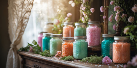 Colorful jars of bath salts arranged elegantly on a wooden table surrounded by flowers in a sunlit room