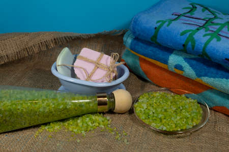 On jute fabric are things for spa treatments - towels, sea salt and soap.