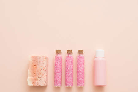 Organic beauty care products. Flat lay of pink bath salt, handmade soap bar and lotion bottle on peach background. Copy space.