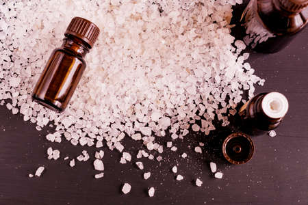 top view of Spa teraetments - sea salt, aroma essential oils on black wooden background