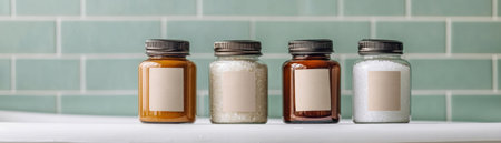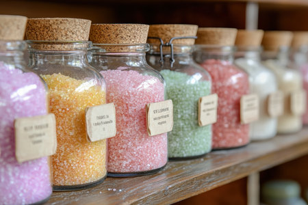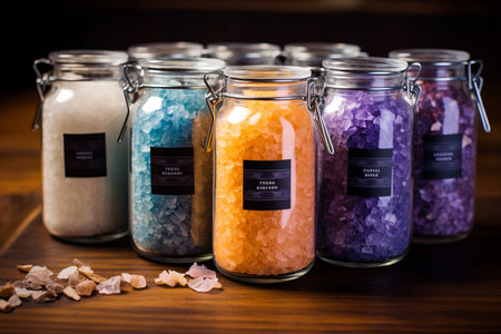 Himalaya or Himalayan. Bath salts in glass jars with labels, neatly arranged on a shelf. Created by ai.