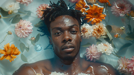 Handsome african american man taking bath with fresh flowers image, ai generated. Black male among floating buds in water photography scene wallpaper. Youth beauty concept photorealistic photo