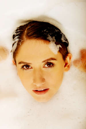 Young woman relaxing in bathtub with foam and bubbles. Close up.