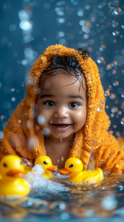 Infant dressed in a vibrant bathrobe, playing with rubber duckies during bath time, joyful water splashes