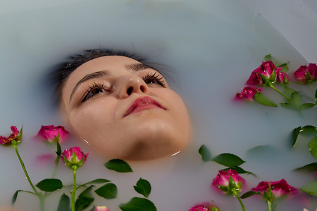 Beautiful girl in milk bath, selective focus on face. Spa and skin care concept. Healthy Face and hands, rejuvenation.