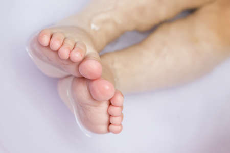 Closeup of childs feet washing in bathroom with shampoo foam on it.