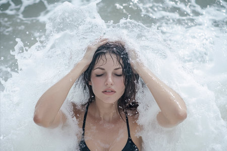 Young woman in a black swimsuit immersed in ocean waves, enjoying a refreshing and serene moment.