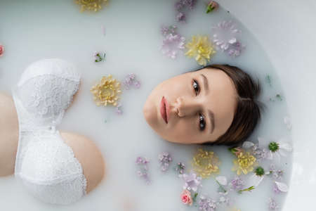Top view of pretty woman looking at camera while taking milk bath with flowers