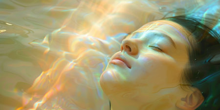 A woman floats peacefully, her face illuminated by the warm glow of the water.