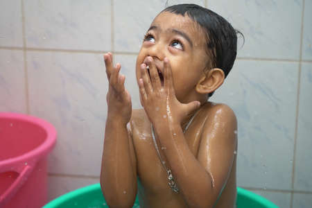 A dark-skinned kid is bathing in a bathtub. The parent bathes the child. The concept of caring, parenthood, and baby health. A close-up portrait with a bokeh effect in the background.