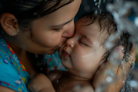 Loving mother gently kisses her baby during a soothing bath, sharing a bond of care and warmth