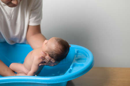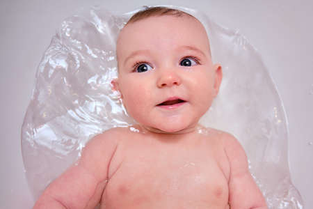 Portrait of an infant baby lying in a children bath. A baby at the age of four months bathes in water