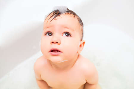 Domestic bathroom. Young man is washing in the bath full of foam.