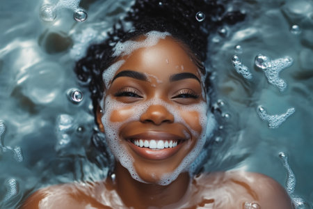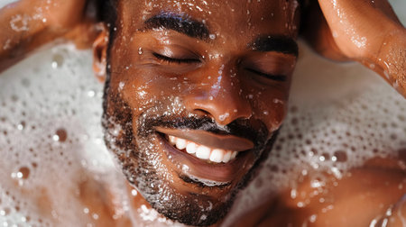 A dark-skinned man with his eyes closed and a joyful expression on his face enjoys bubble bath, drops of water glistening on his face, emphasizing the moment of pure bliss. Soft masculinity