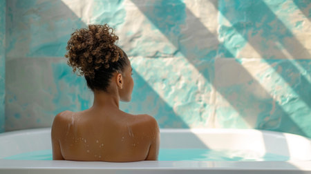back view curly black girl laying, relaxing in the bath. Beauty care, spa treatments and relax at home. Cheerful young african american female enjoying warm water in bathroom interior in morning.