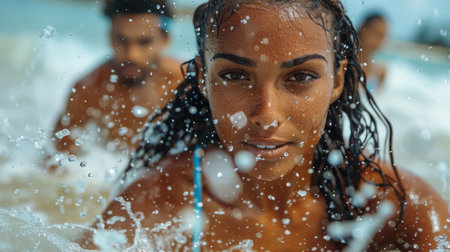 A woman gracefully swims in sparkling waters while a man plays beach volleyball in the background.