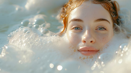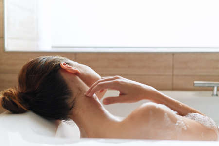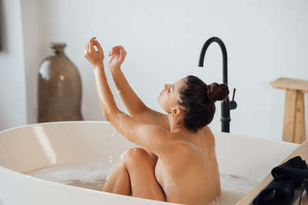The young woman enjoys a bath with water of white colour