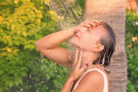 Young woman in the shower outdoors.