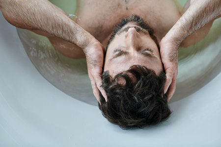 depressed traumatized man with beard lying in bathtub during breakdown, mental health awareness