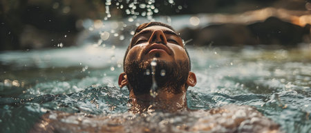 Man Embraces Nature's Shower for Post-Exercise Renewal. Concept Nature, Exercise, Renewal, Wellness, Outdoors