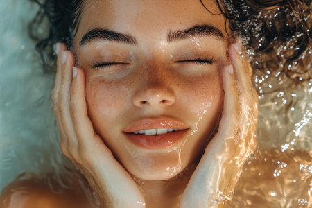A beautiful woman with a bob hairstyle washes her face under a gentle stream of water, enjoying the refreshing sensation. The moment captures her peaceful expression and the natural glow of her skin.