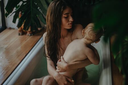 Mother bathes in bathtub with her baby on background of houseplants.