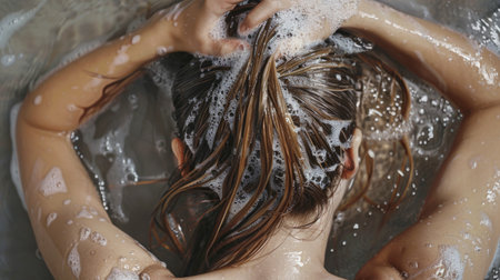 woman seen from behind, washing her hair generative ai