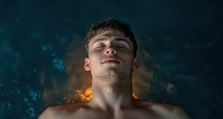 Man with eyes closed in water surrounded by leaves, serene portrait, AI generated