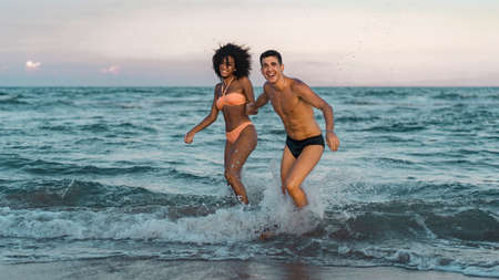 Full length portrait of Interracial young couple having fun relaxing on the beach holding hands on the water. Summertime fun concept.