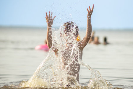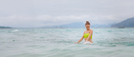 Young woman playing in the sea in summer. woman enjoying in sea water.Cheerful young woman having fun on the beach. She is relaxed in the sea water and enjoys on vacation.Copy space.