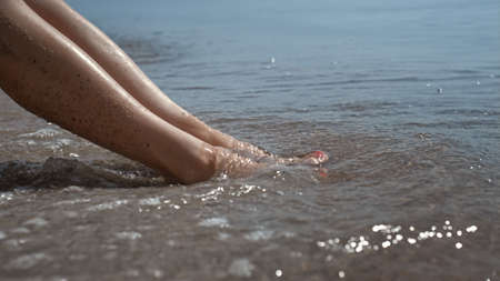 Hot tanned woman legs smeared wet beach sand on sunlight closeup. Unknown sexy lady sunbathing washing bare feet in calm ocean waves. Young attractive girl sitting beautiful seacoast. Vacation concept