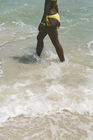 Low section of African-american woman walking on beach on a sunny day