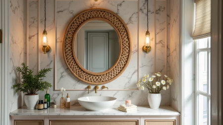 Elegant marble bathroom interior with oval mirror and decorative lighting. That the image is generated using AI.