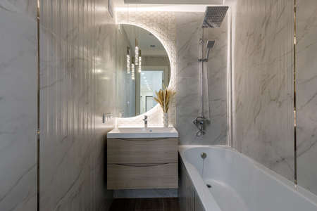 Modern new luxury bathroom. Interior design with marble, wood and stainless steel. Round mirror with led light behind
